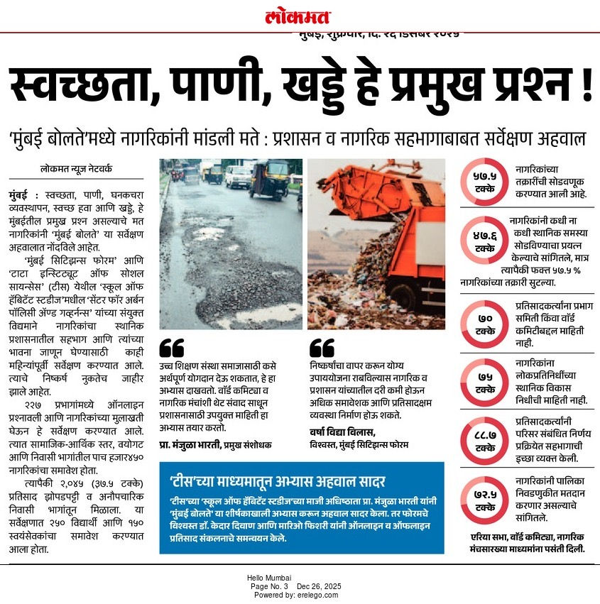 Survey Reveals Mumbai Citizens' Perspective on Local Governance and Citizen Participation Sanitation, Water, Solid Waste, Clean air and Potholes are main issues for majority of Mumbaikars 70% of the r